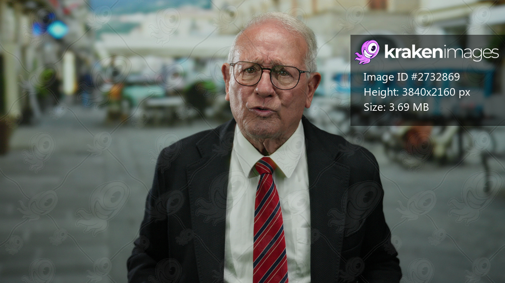 Senior man in business suit gesturing passionately on a busy outdoor street with blurred buildings and a vibrant urban background.