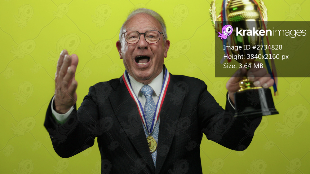 Senior man in business suit holding trophy and medal against yellow background celebrating success and achievement with a joyful smile.