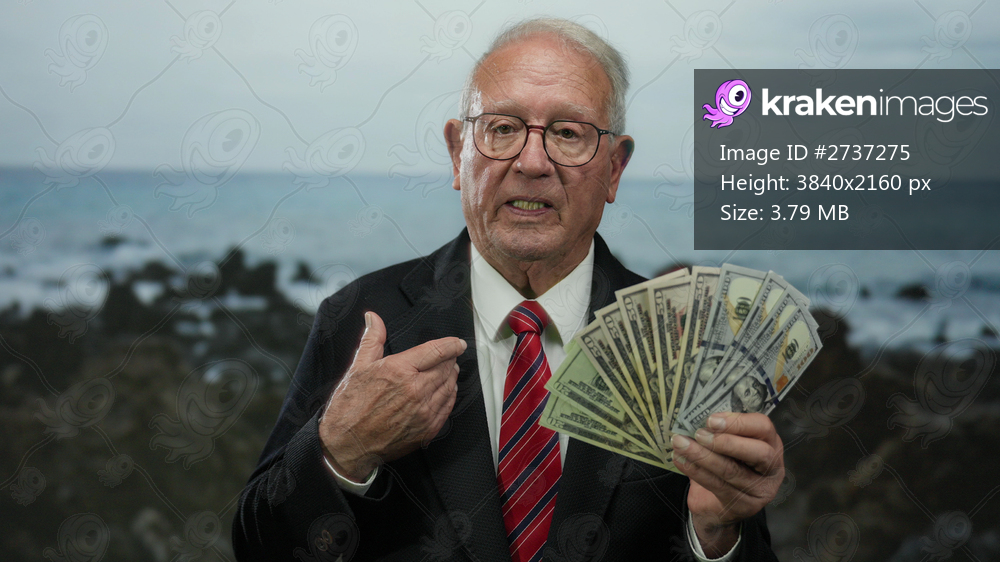 Senior man in business suit holding us dollars at seaside beach, conveying success and wealth with ocean backdrop.