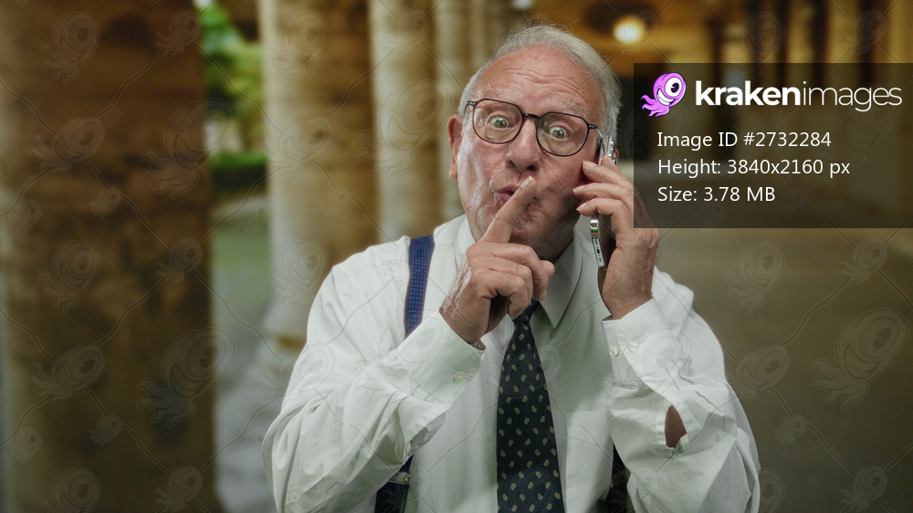 Senior man in business suit makes a silence gesture while speaking on a phone in an old university hallway.