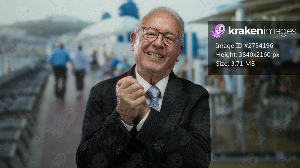 Senior man in business suit on boat smiles warmly in outdoor setting, encapsulating a sense of leisure and professionalism in a nautical environment.