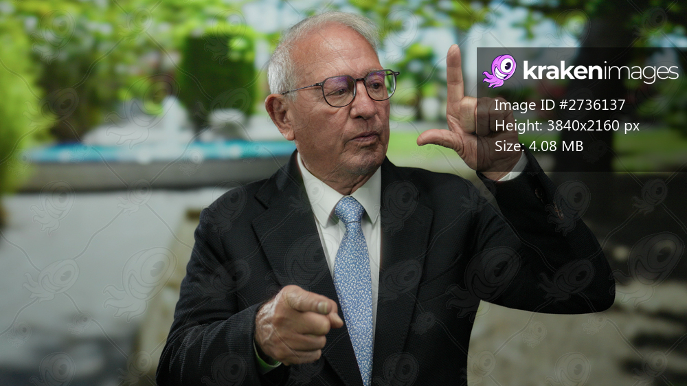 Senior man in business suit pointing and gesturing energetically in a lush green park setting.