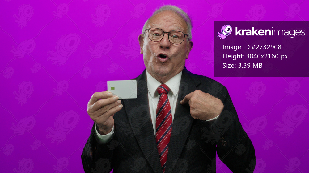 Senior man in business suit points at credit card against vibrant pink background, showcasing business and finance concepts with an isolated focus.