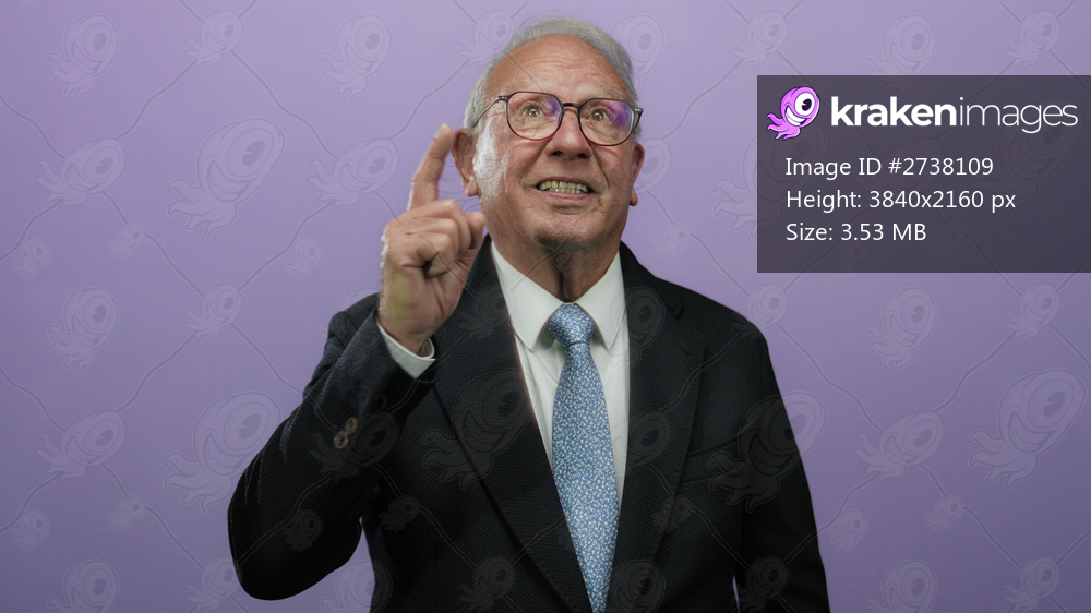 Senior man in business suit points upward against an isolated purple background, conveying a thoughtful and professional expression.