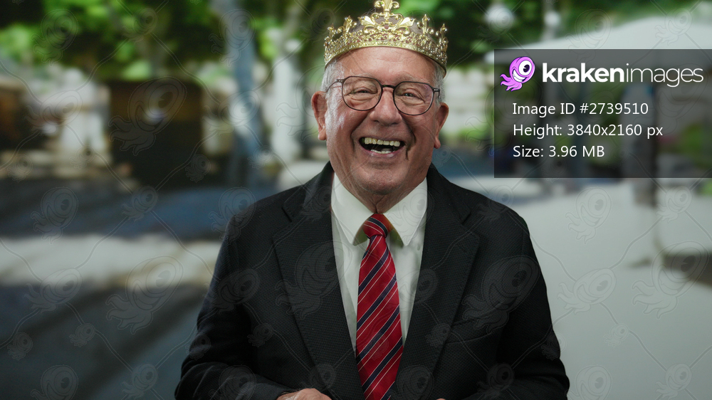 Senior man in business suit and red tie joyfully laughing with a golden crown outdoors on a sunny day.