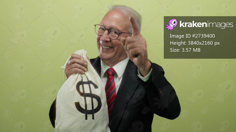 Senior man in business suit smiling with dollar bag, symbolizing wealth and corruption, on an isolated yellow background.