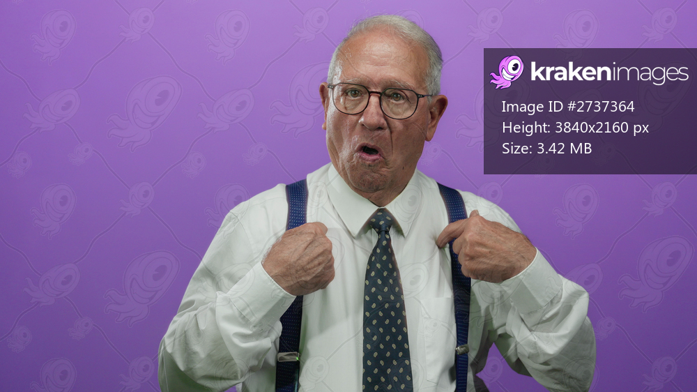 Senior man in business suit with surprised expression pointing to himself against isolated purple background.