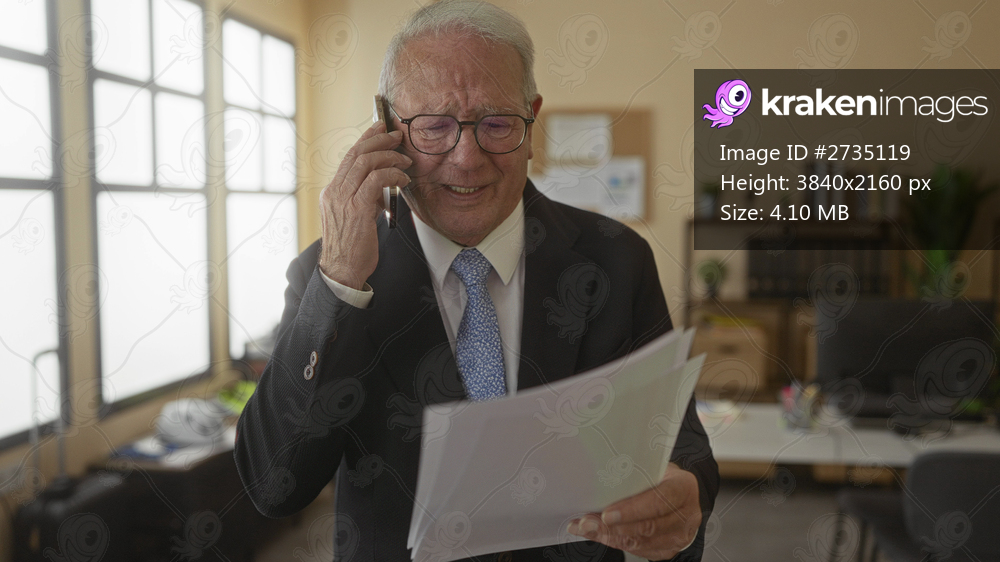 Senior man in business suit talking on phone holding documents in modern office, conveying urgency and professionalism with a focused expression and corporate setting. - Kraken Images