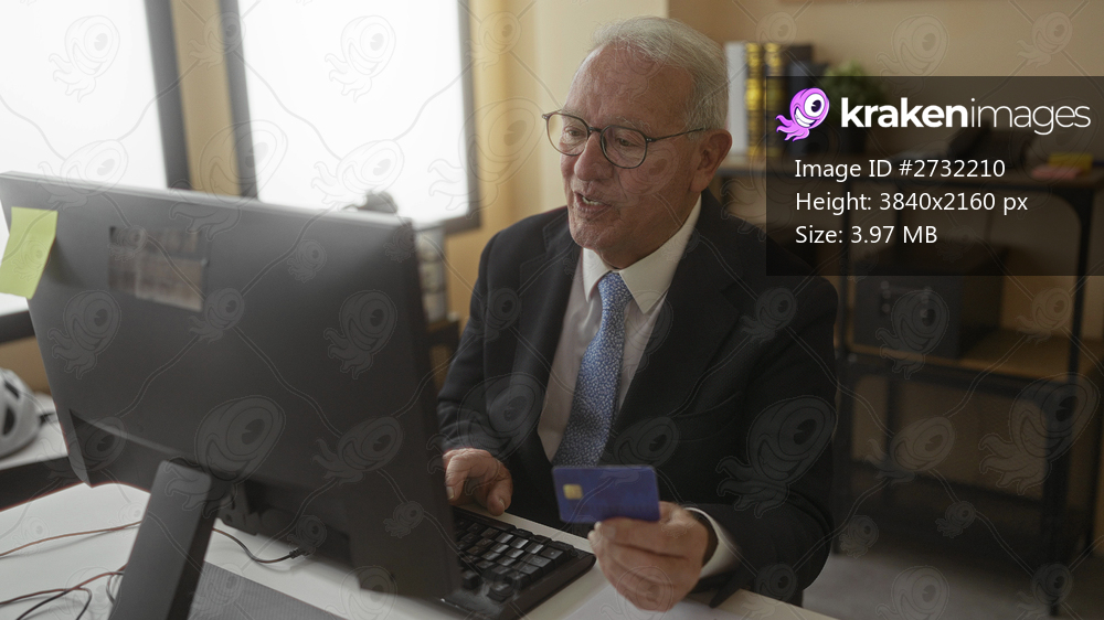 Senior man in business suit using computer in office holding credit card indicating online transaction with smile in professional workplace interior setting - Kraken Images