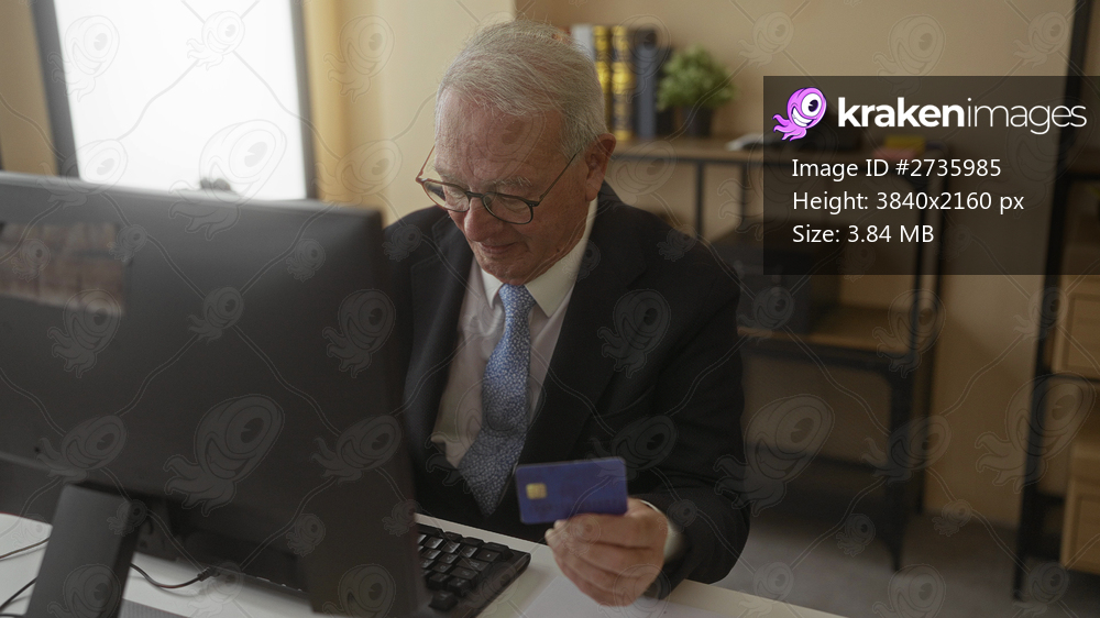 Senior man in business suit using computer in office holding credit card indicating online transaction with smile in professional workplace interior setting - Kraken Images