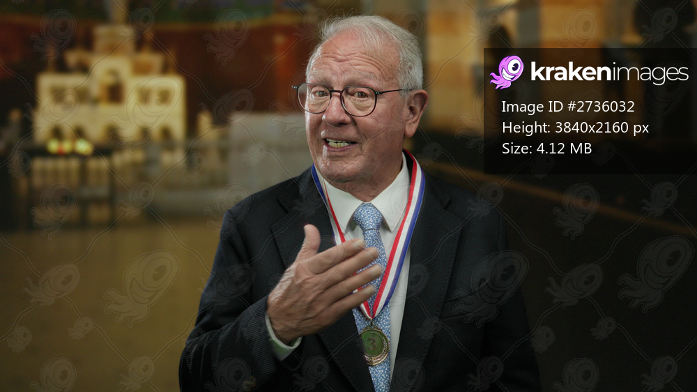 Senior man in business suit wearing medal stands in church interior with hand on chest, expressing emotion with a blurred ornate background, capturing a moment of pride. - Kraken Images