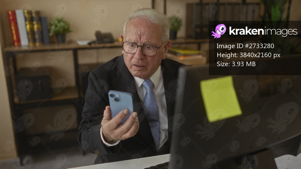 Senior man in business suit working at a computer in an office, checking his smartphone, surrounded by books, plants, and stationery, conveying a professional workplace setting. - Kraken Images