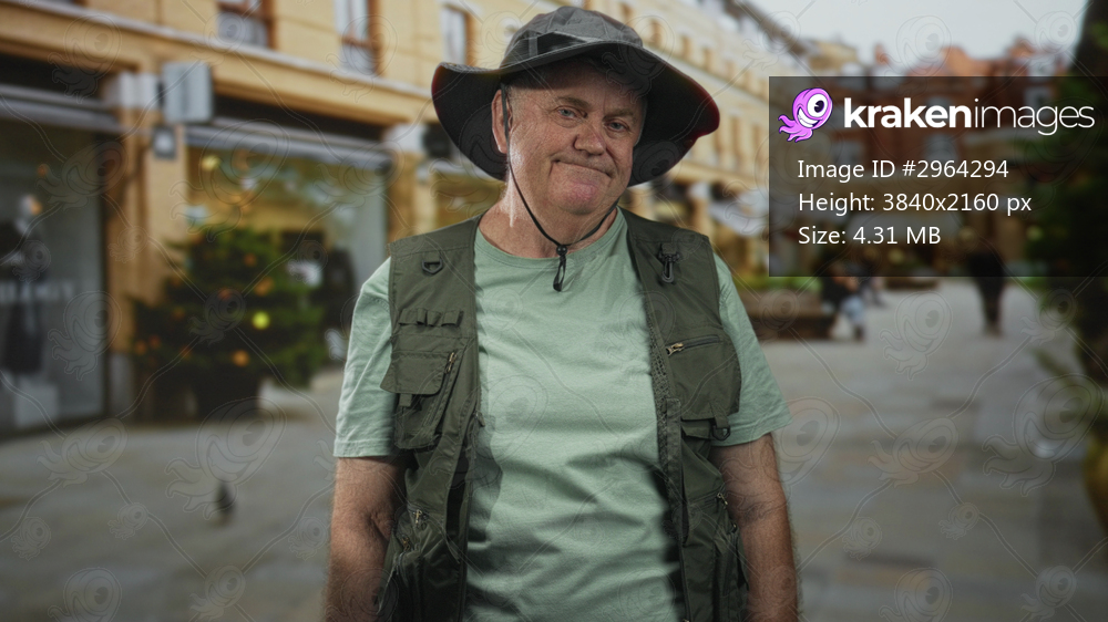 Senior man in fishing vest and wide brim hat, arms relaxed and standing on a pedestrian street with shops; contentment exploration.
