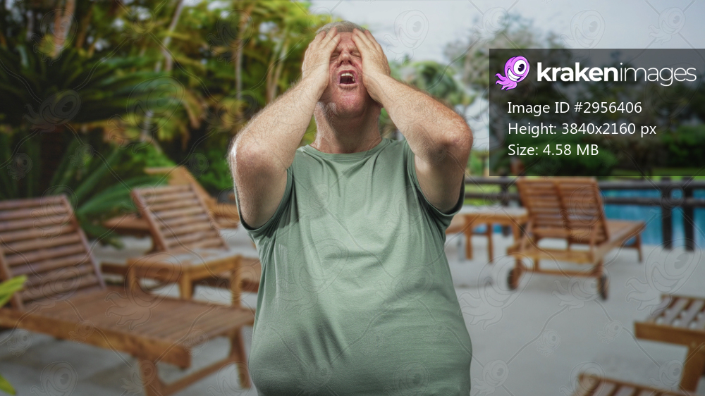 Senior man in green shirt with hands over eyes gasps beside pool and wooden loungers at building; frustration fatigue.