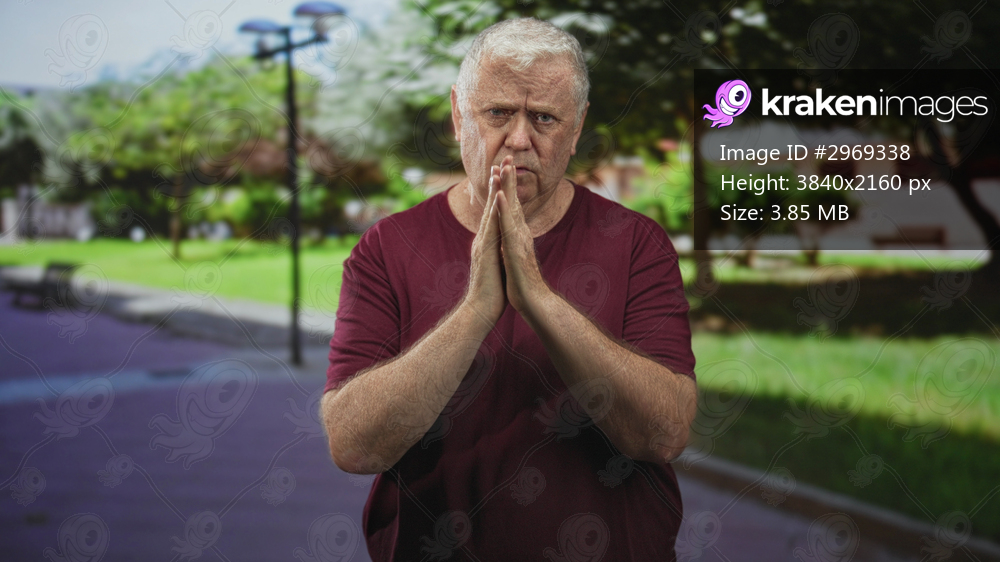 Senior man in maroon shirt rubbing hands and holding wrist on street pathway by lamppost and bench; discomfort aging.