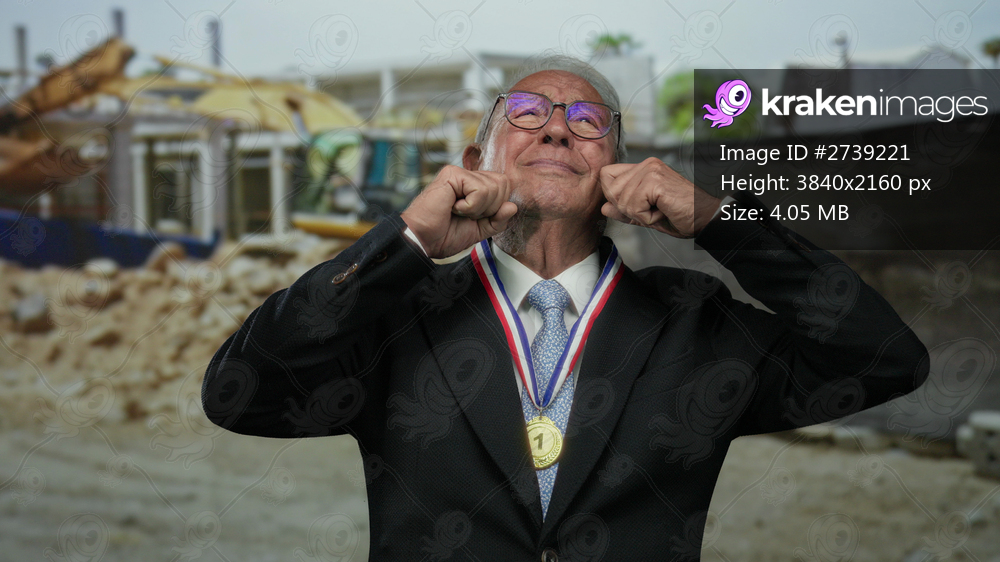 Senior man in suit at construction site gestures crying with medal showcasing emotions of success and nostalgia in business environment.