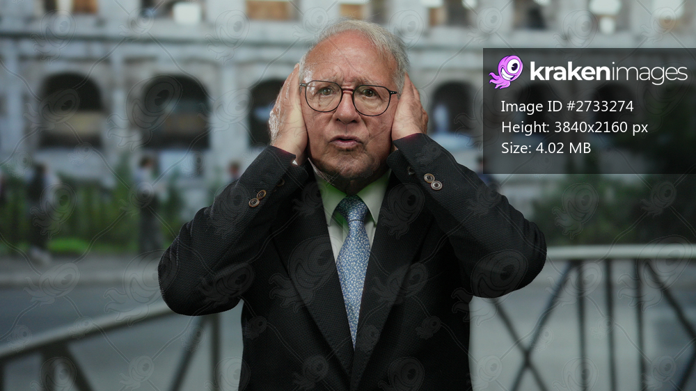Senior man in suit covers ears with hands near roman coliseum indicating stress on the street.