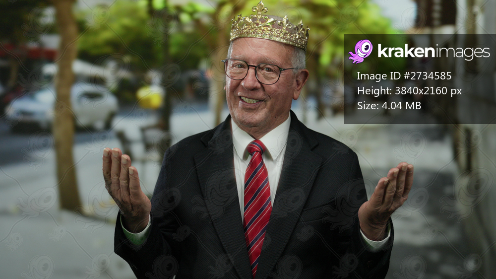 Senior man in suit and crown gestures joyfully on a vibrant street, embodying celebration and elegance in an urban outdoor setting.