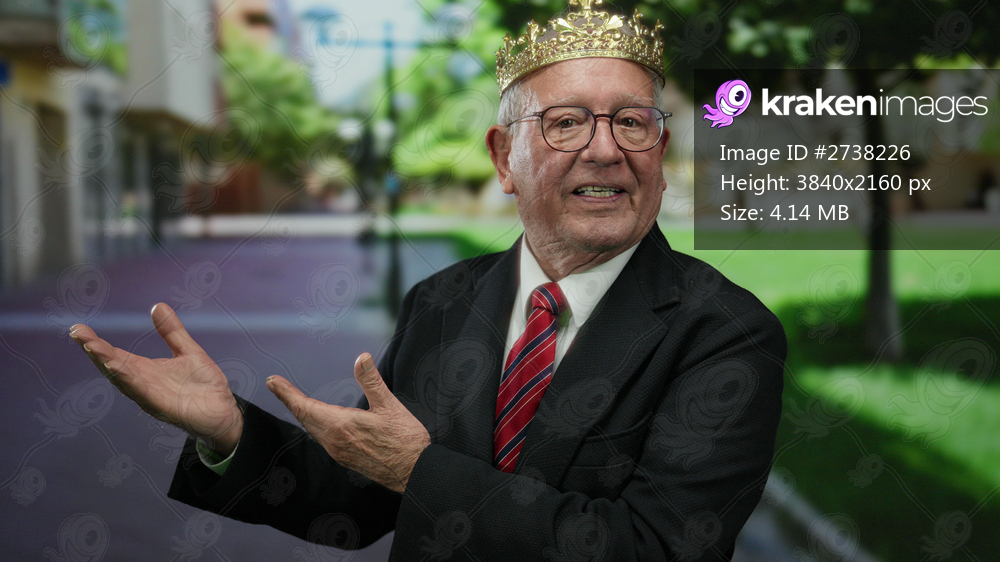 Senior man in suit with crown gestures outdoors on a city street, embodying confidence and leadership, surrounded by vibrant greenery and urban buildings, suggesting a regal presence. - Kraken Images