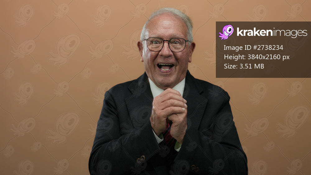 Senior man in suit expresses surprise over isolated brown background emphasizing emotion and business attire with hands uncovering face.