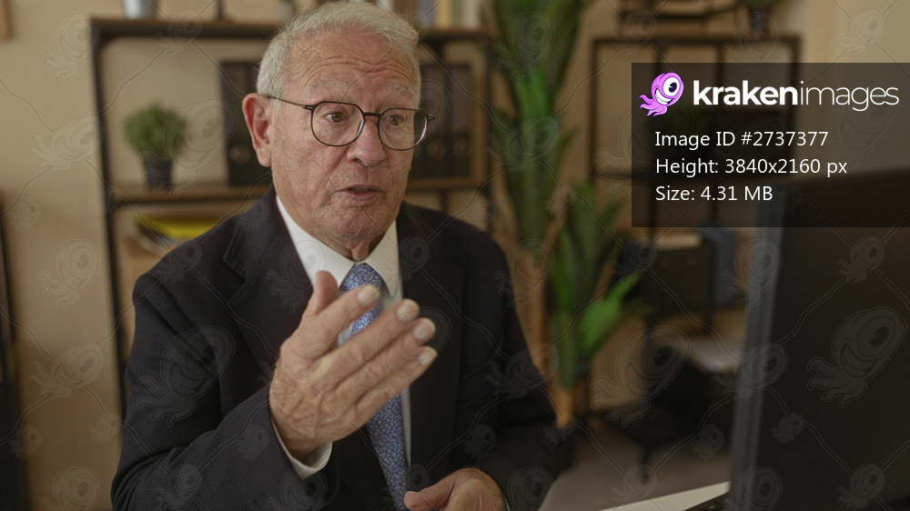Senior man in suit having a video call in a modern office, surrounded by plants and shelves, expressing animatedly at his computer screen.