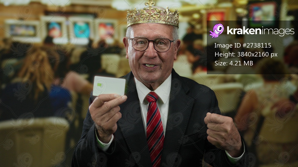 Senior man in suit holding card wearing crown in busy art gallery with blurred people and paintings in background, conveying a sense of authority and business in a cultured setting. - Kraken Images