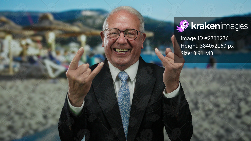 Senior man in suit making rock gesture on beach with ocean in background, blending business with fun in an outdoor coastal setting, expressing joy and confidence. - Kraken Images