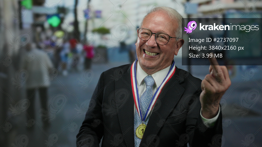 Senior man in suit with medal makes rude gesture on busy street, displaying contrasting emotions in an outdoor urban setting, capturing a moment of humor and surprise. - Kraken Images