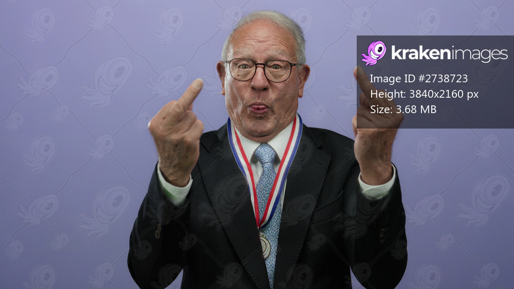 Senior man in suit with medal making gesture against purple background