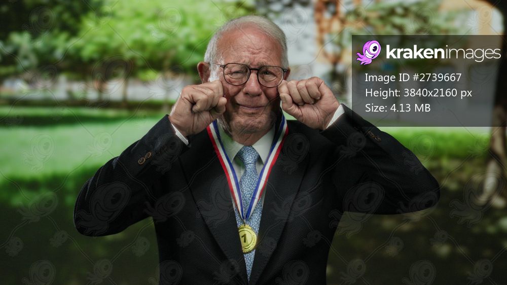 Senior man in suit with medal mimicking crying in a park, showcasing emotions and achievement outdoors.