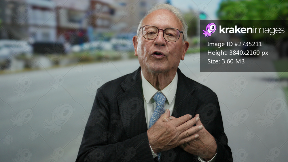 Senior man in suit on a street joyfully gestures with both hands on chest expressing excitement in an outdoor urban setting, with blurred cityscape in the background. - Kraken Images