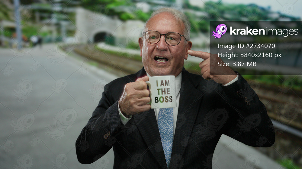 Senior man in suit pointing at his smile with a boss mug in hand at an outdoor train station, expressing confidence and authority in a business setting. - Kraken Images