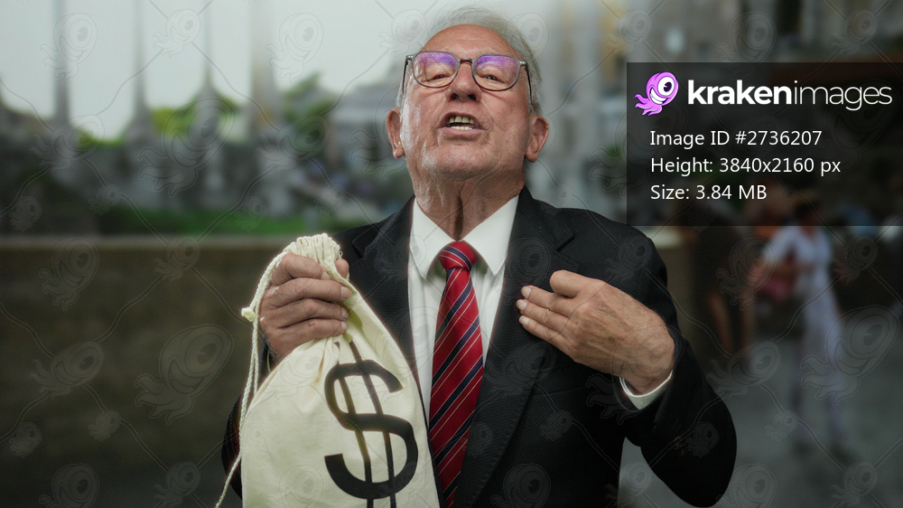 Senior man in suit showing ok gesture holding money bag in ancient roman ruins, implying corruption in business dealings outdoors.