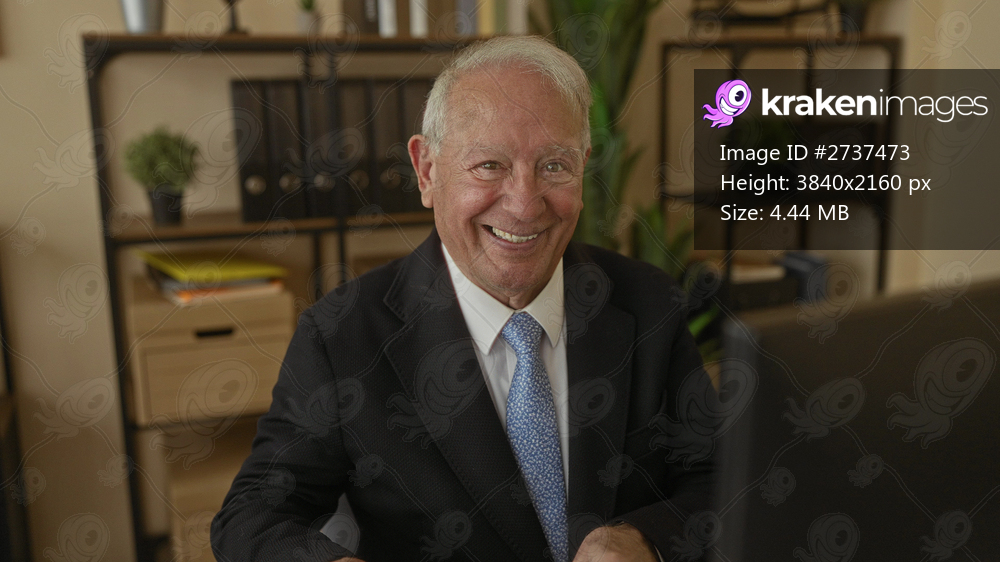 Senior man in suit smiling at camera in office interior, exuding warmth and professionalism.