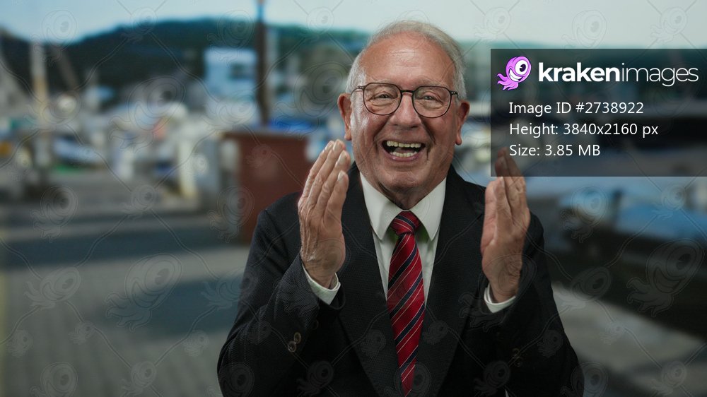 Senior man in suit smiling by seaside promenade, showcasing happiness and success in an outdoor business setting.
