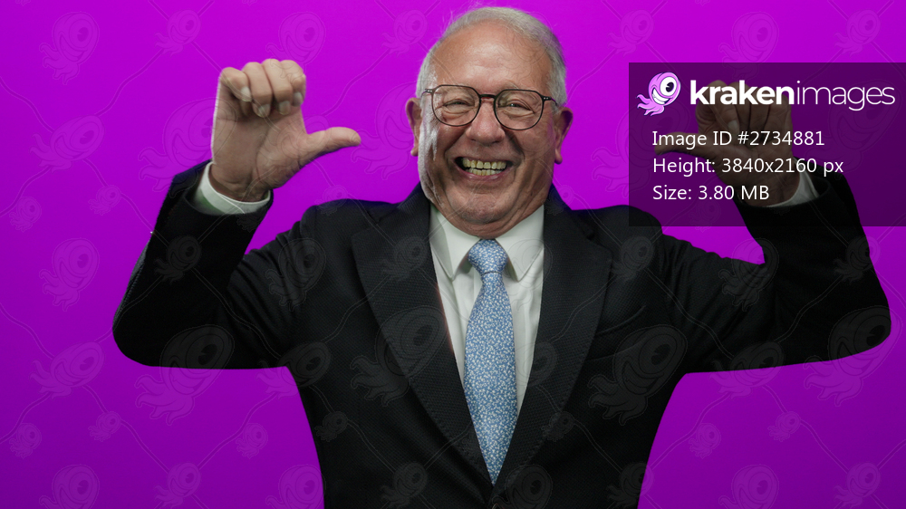 Senior man in suit smiling and pointing to himself with both thumbs against vibrant pink background, conveying confidence and pride in business setting. - Kraken Images