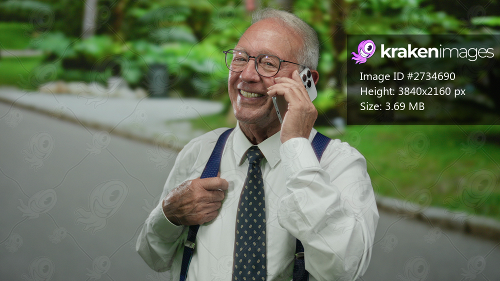 Senior man in suit talking on smartphone, smiling outdoors in lush green park environment, conveying business and communication themes.