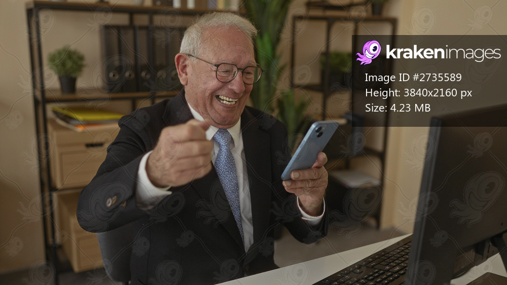 Senior man in suit using smartphone is sitting at desk in modern office showing excitement and joy at successful news