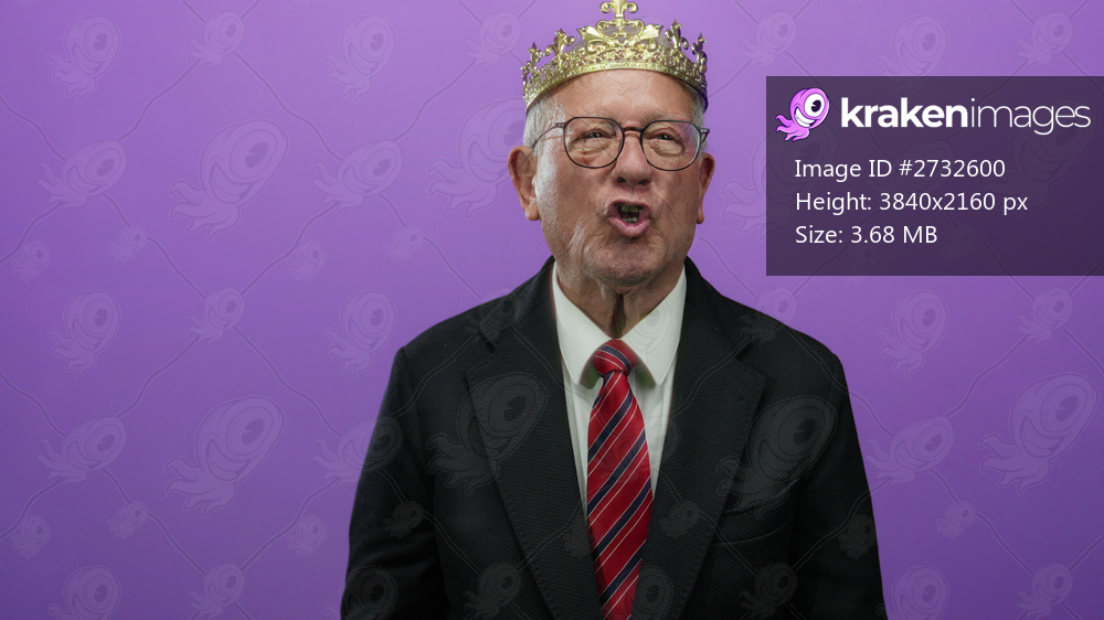 Senior man in suit wearing a crown, standing against an isolated purple background wall, expressing excitement with hand gesture.