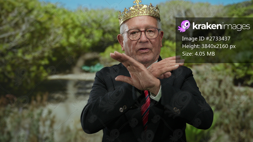 Senior man in suit wearing crown gesturing no with fingers in park with green trees scenic backdrop outdoor setting business attire implying authority and grandeur - Kraken Images