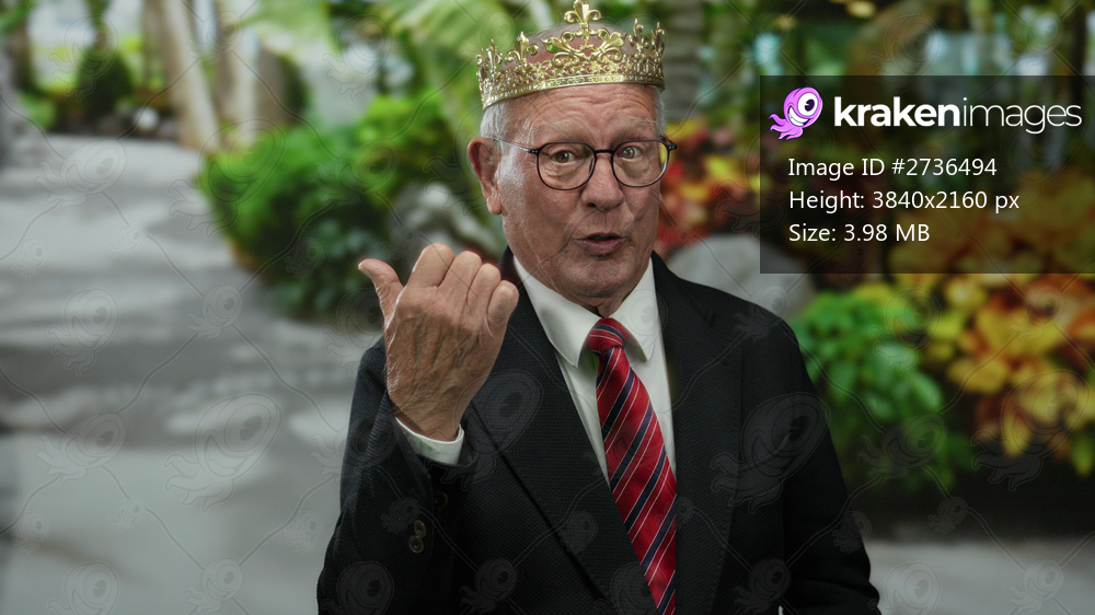 Senior man in suit wearing crown smiles while pointing thumb outdoors in lush street, suggesting royalty and confidence.