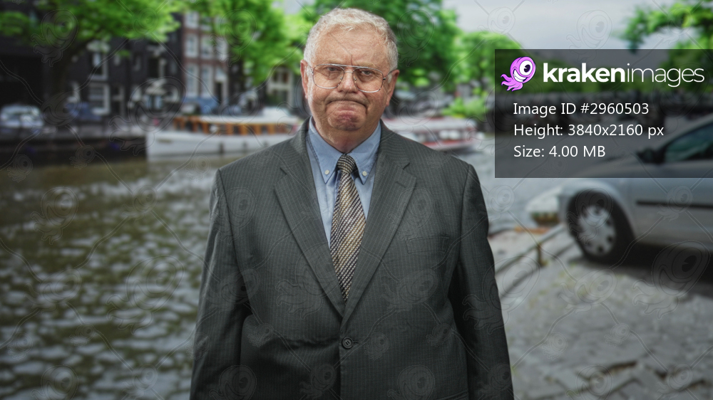 Senior man in suit wearing glasses and striped tie with pursed lips standing beside a canal on street with parked car and tour boat; resignation solitude. - Kraken Images