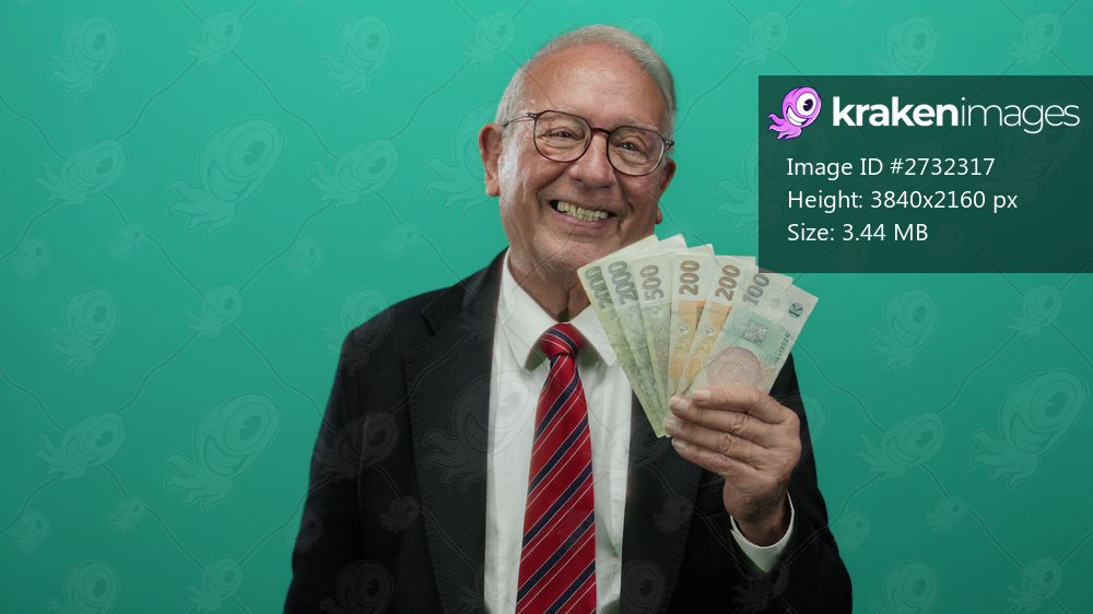 Senior man joyfully holding czech koruna banknotes in front of a green background, illustrating business success and wealth.