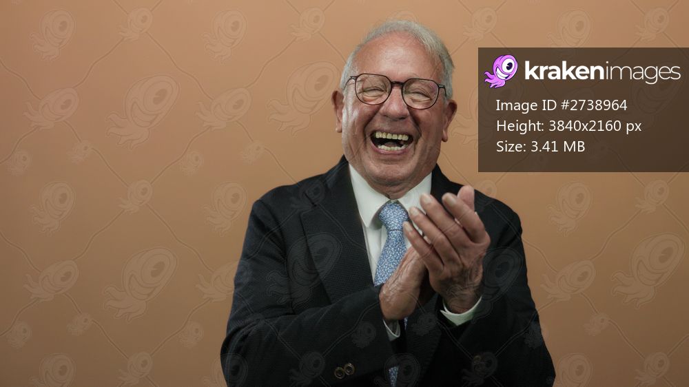 Senior man laughing and clapping in a business suit against an isolated brown background, conveying joy and success in a professional setting.