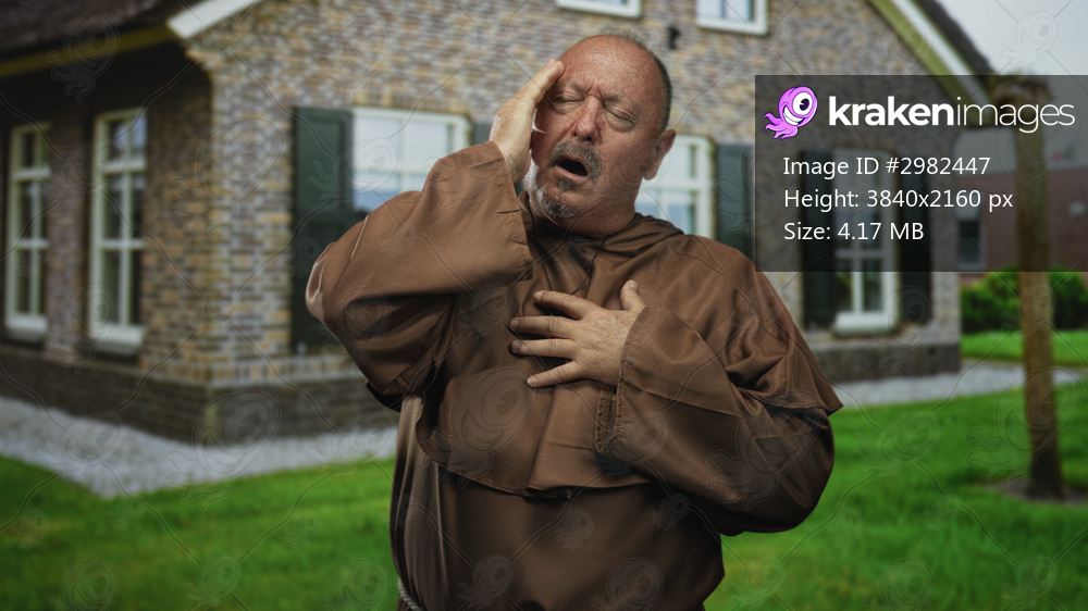 Senior man monk in brown robe clutching chest, hand to forehead, standing on lawn in front of building; distress concern.