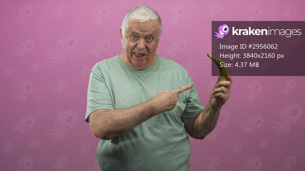 Senior man points finger to banana while holding it with other hand in studio pink backdrop, smiling and engaging directly with camera; playful.