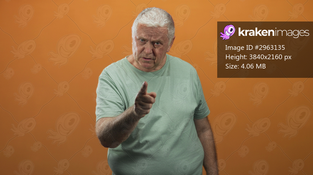 Senior man points finger to camera in studio with orange backdrop, wearing mint t shirt and furrowed brow; reprimand warning.