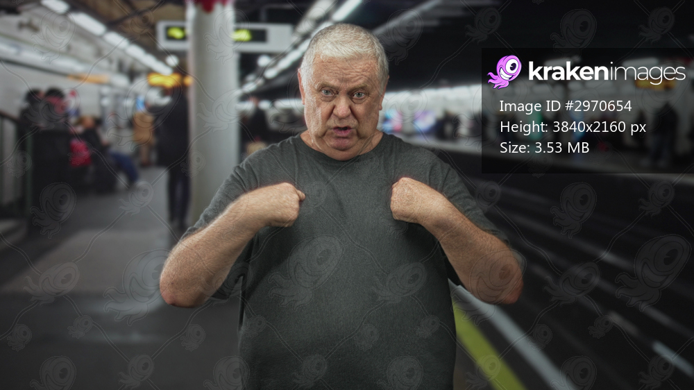 Senior man points hands to chest on a crowded subway station platform inside building; identity defiance.