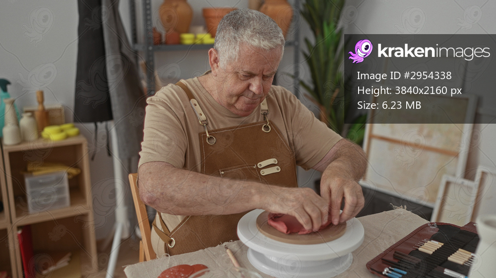 Senior man potter shaping red clay with hands on a potter wheel while wearing apron in studio; calm patience.