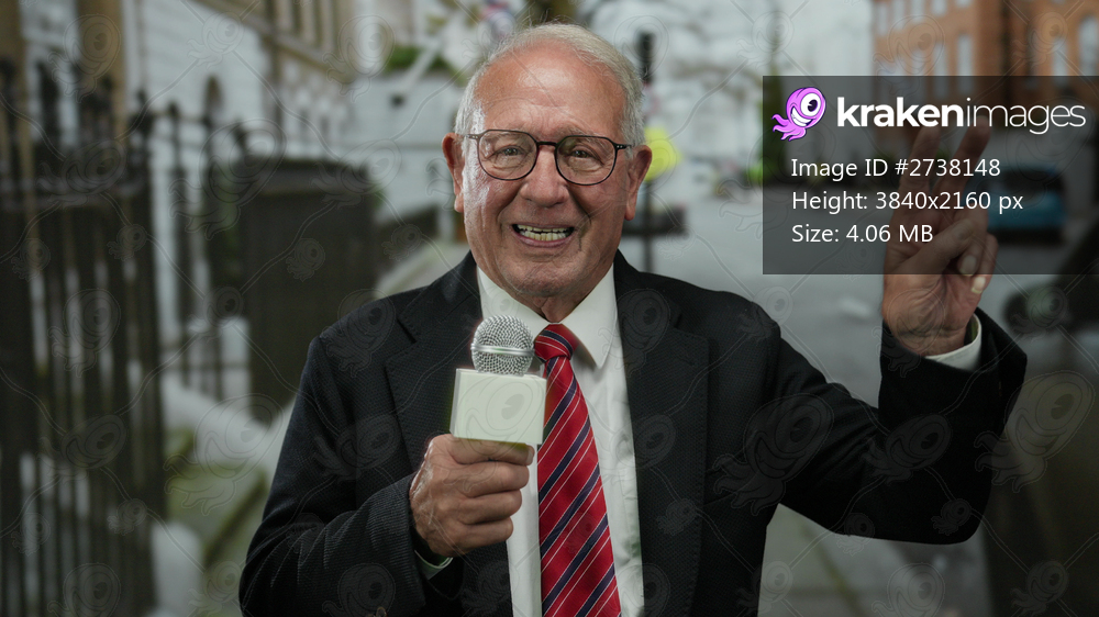 Senior man reporting with microphone on urban street, wearing business suit and tie, gesturing with fingers, smiling confidently in outdoor setting.
